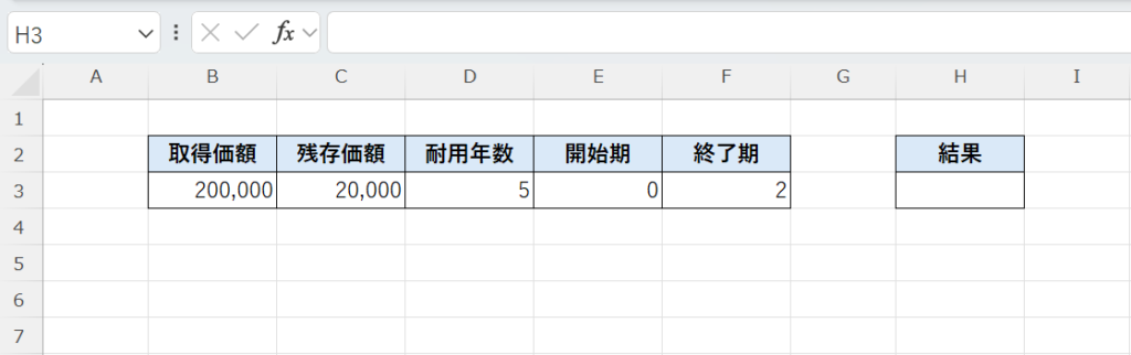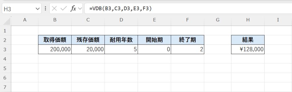 VDB関数は、取得価額・残存価額・耐用年数をもとに、指定した期間(開始期〜終了期)の減価償却費を求める関数です。