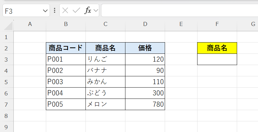 たとえば、下の表のように商品コード・商品名・価格が一覧になっている場合、