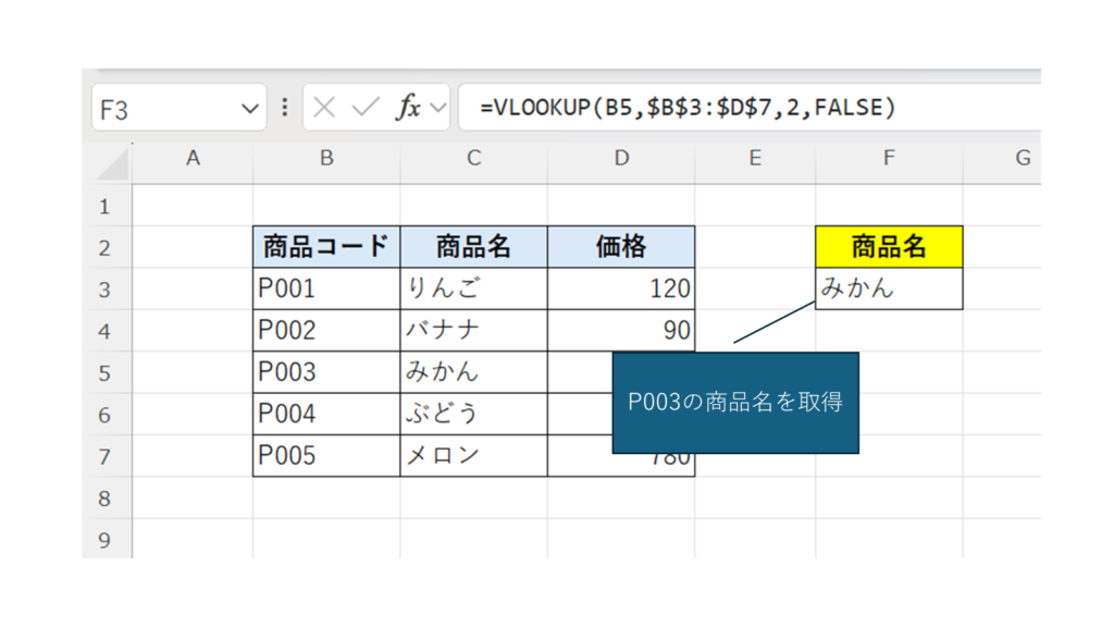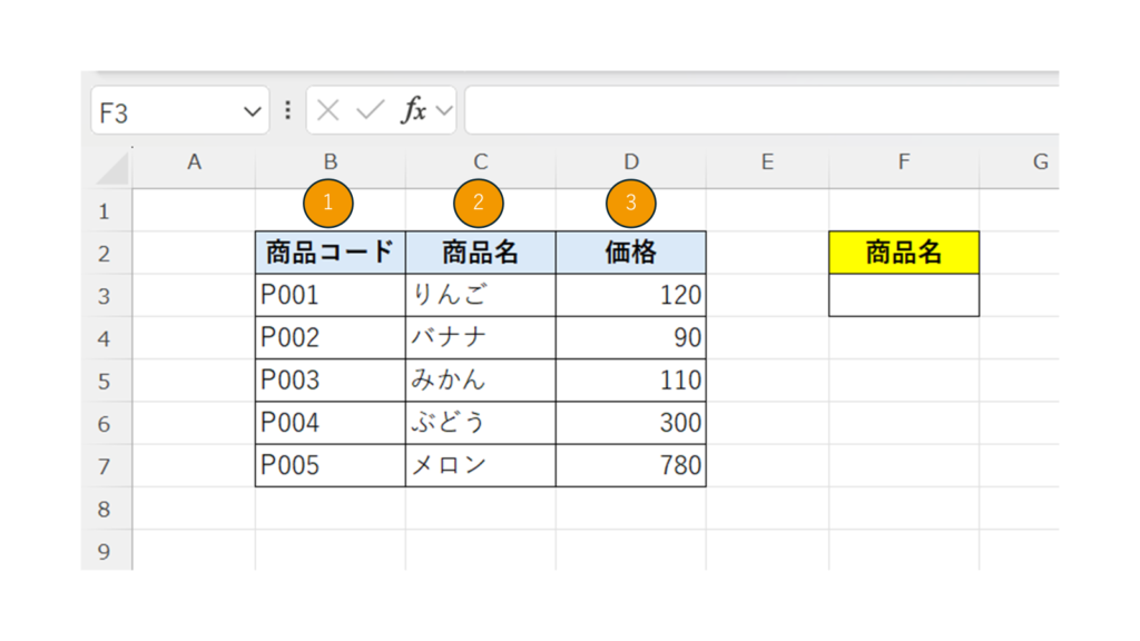 範囲:商品一覧の表全体を指定します。この中から、Excelが「P003」を探して一致する行を見つけます。