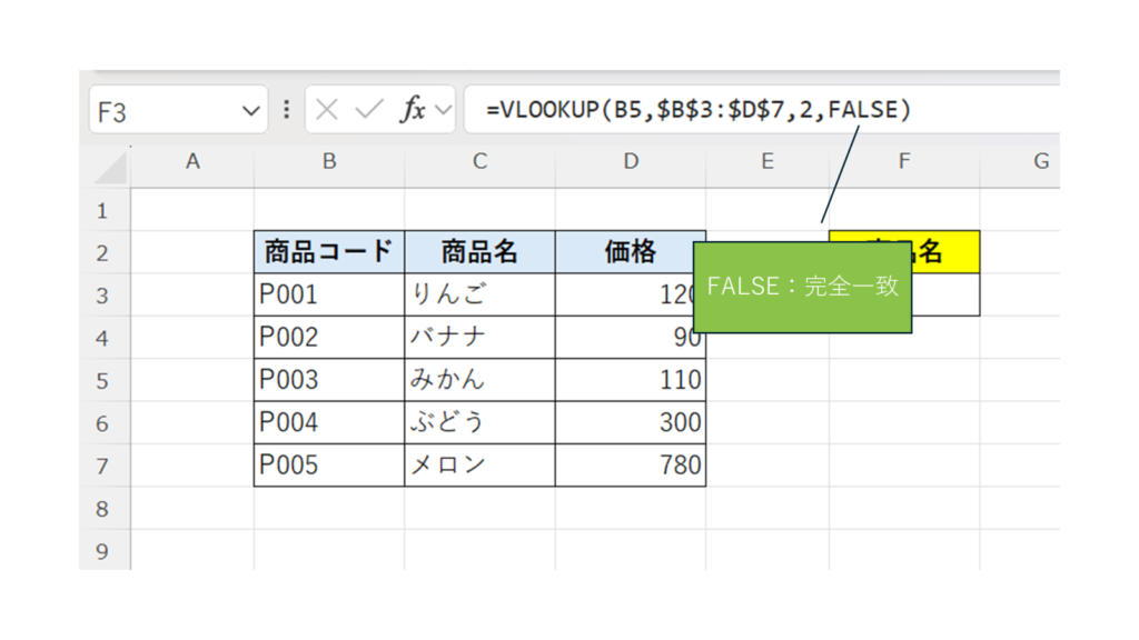 検索方法:「FALSE」 … 「完全に一致する商品コードだけを探す」という指定です。