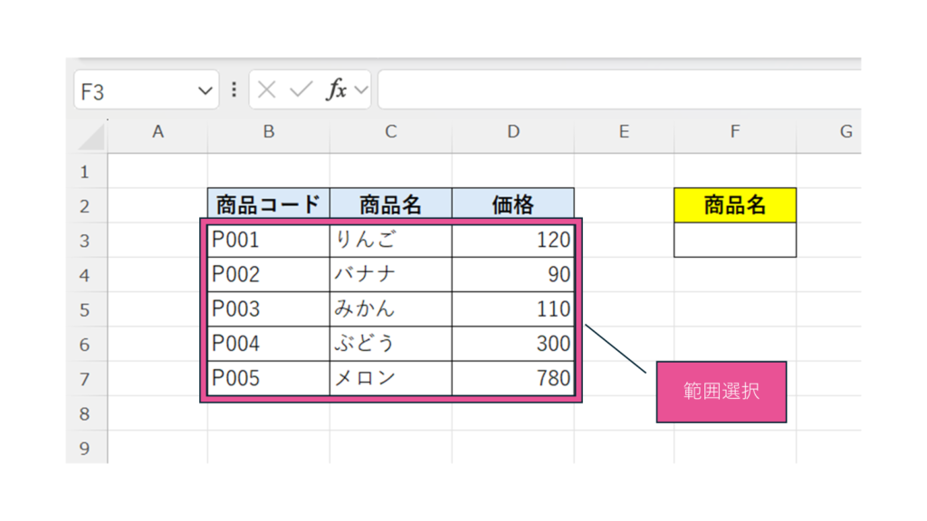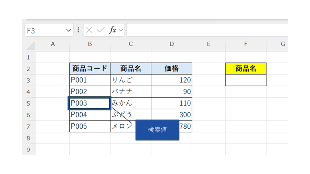 検索値:今回は商品コード「P003」の商品名を探すので検索値は「P003」が入力されているセルB5になります。