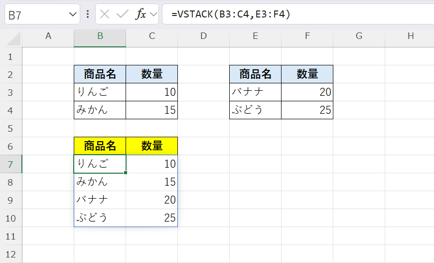 この例では、VSTACK関数を使って2つの表を縦方向に結合しています。
