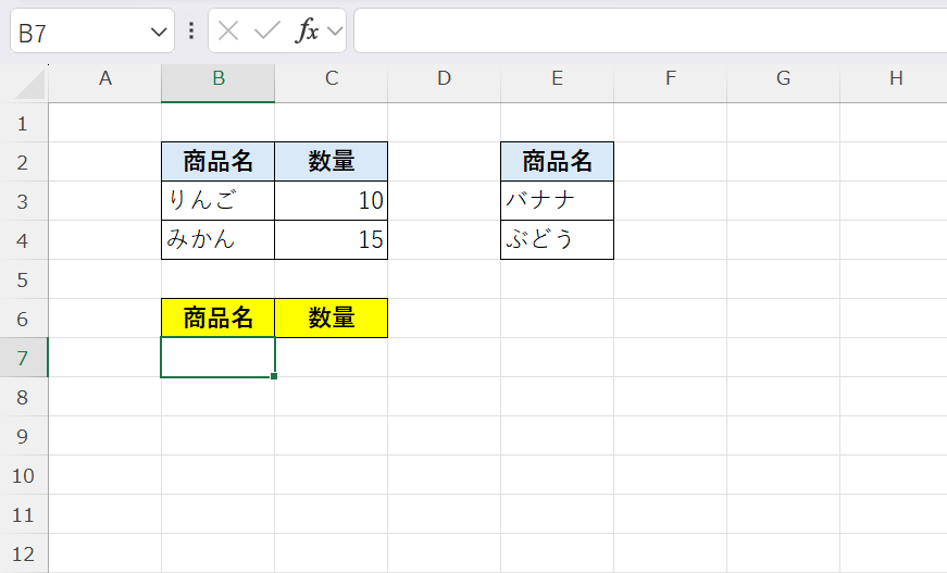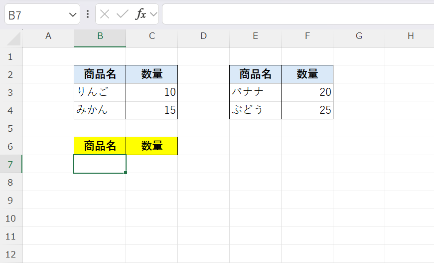B3:C4のデータの下に、E3:F4のデータがそのまま追加されるため、別々の表を1つの一覧としてまとめることができます。