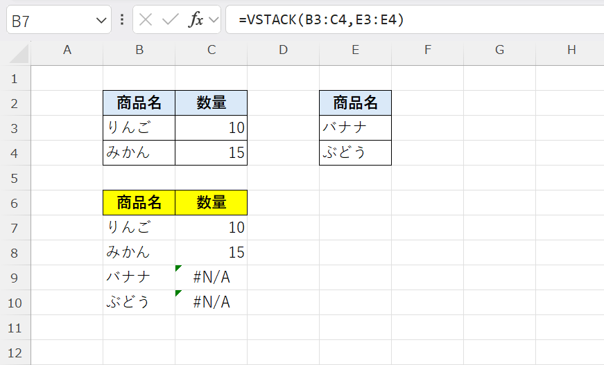 VSTACK関数は、最も列数が多い配列に合わせて結果を返すため、不足している列には「#N/A」が表示されます。
