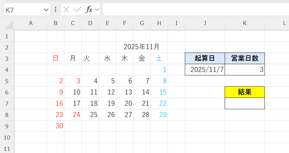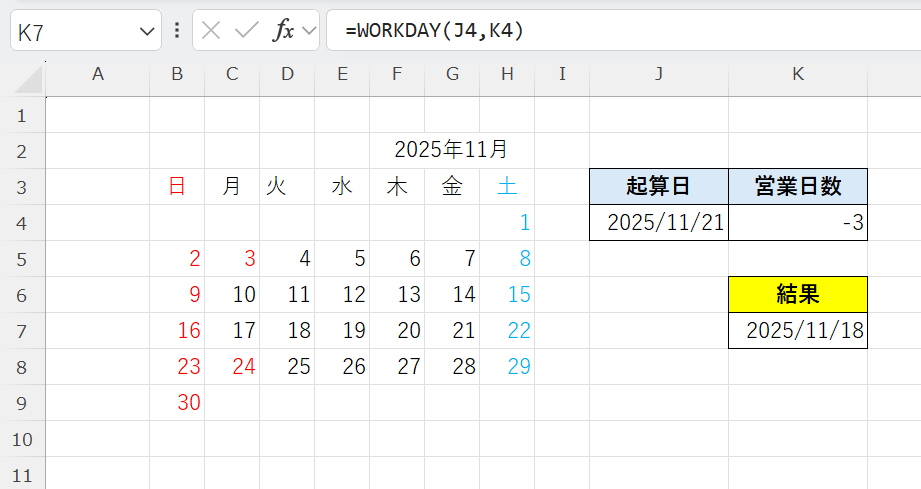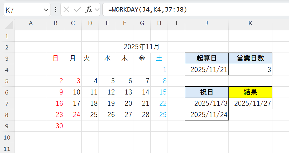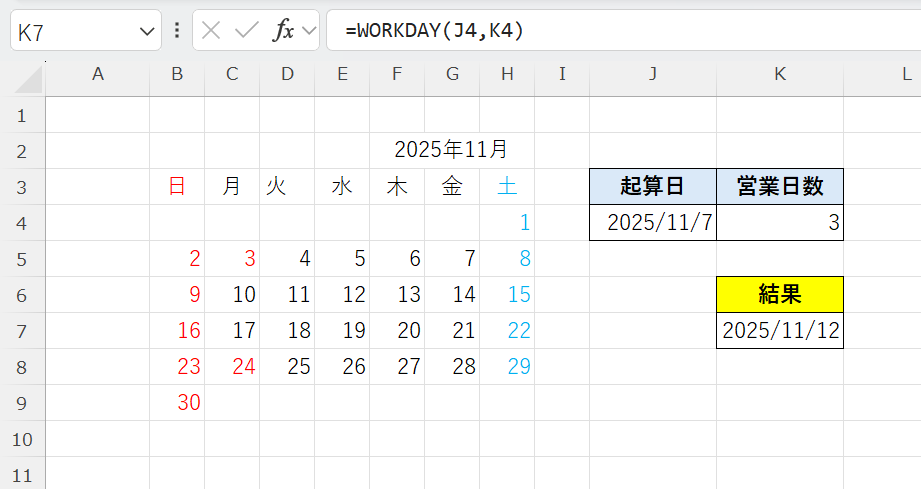 ここでは 2025/11/7(金)の3営業日後をWORKDAY関数で求めてみましょう。