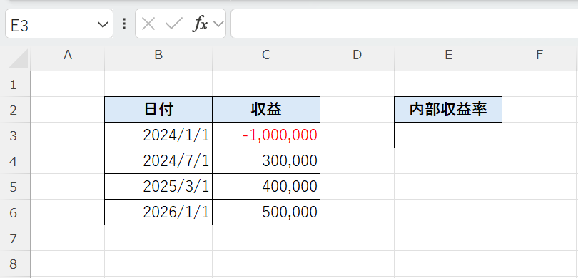 初期投資はマイナス、収益はプラスの値で入力します。