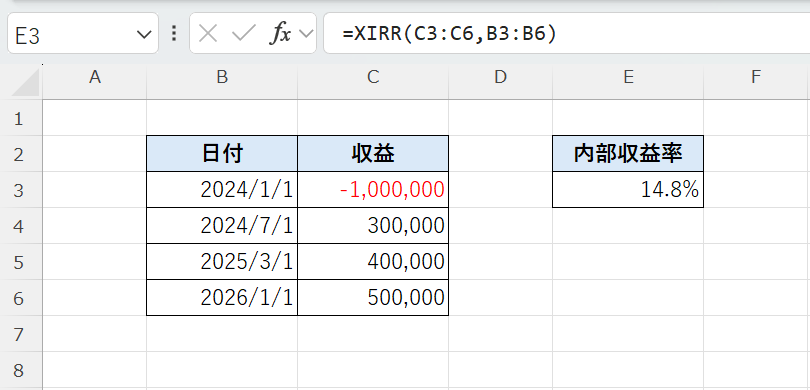 XIRR関数は、キャッシュフローと日付をもとに、投資の内部収益率を求める関数です。