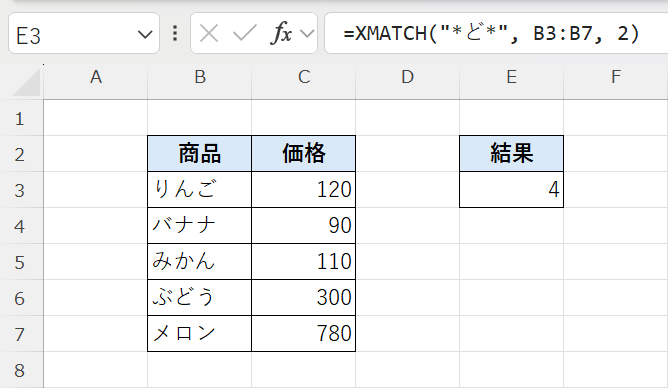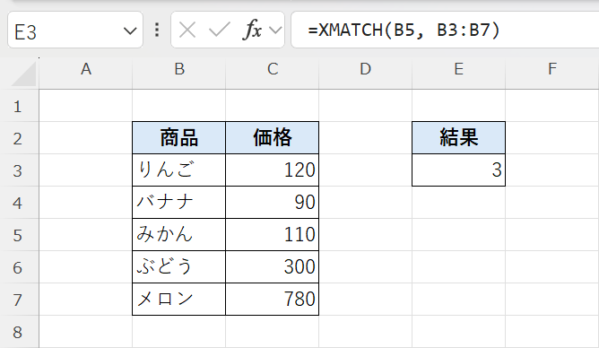 → 「B3:B7 の中で『みかん』が何番目にあるか」を調べます。