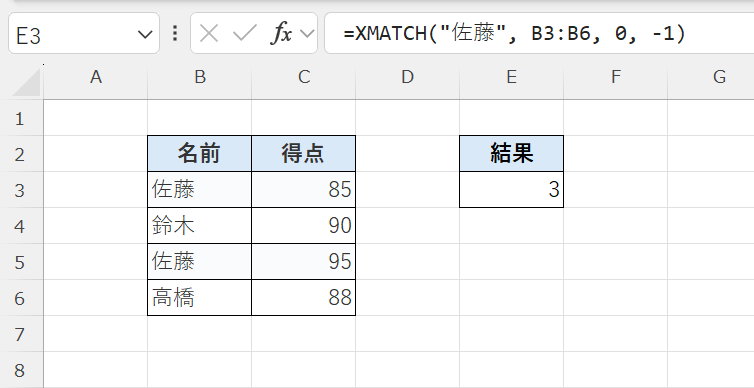 =XMATCH("佐藤", B3:B6, 0, -1)