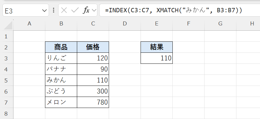 =INDEX(C3:C7, XMATCH("みかん", B3:B7))