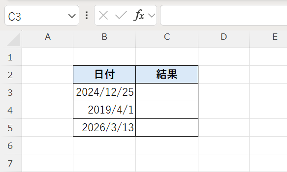 たとえば、セルB3に 2024/12/25 が入力されている場合、次のように入力します。