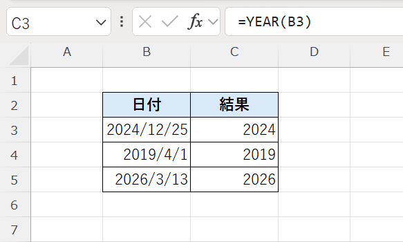 YEAR関数とは、日付データから「年(西暦)」だけを取り出す関数です。