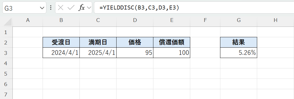 YIELDDISC関数は、割引債の利回りを求める関数です。